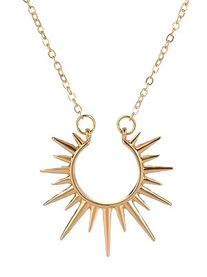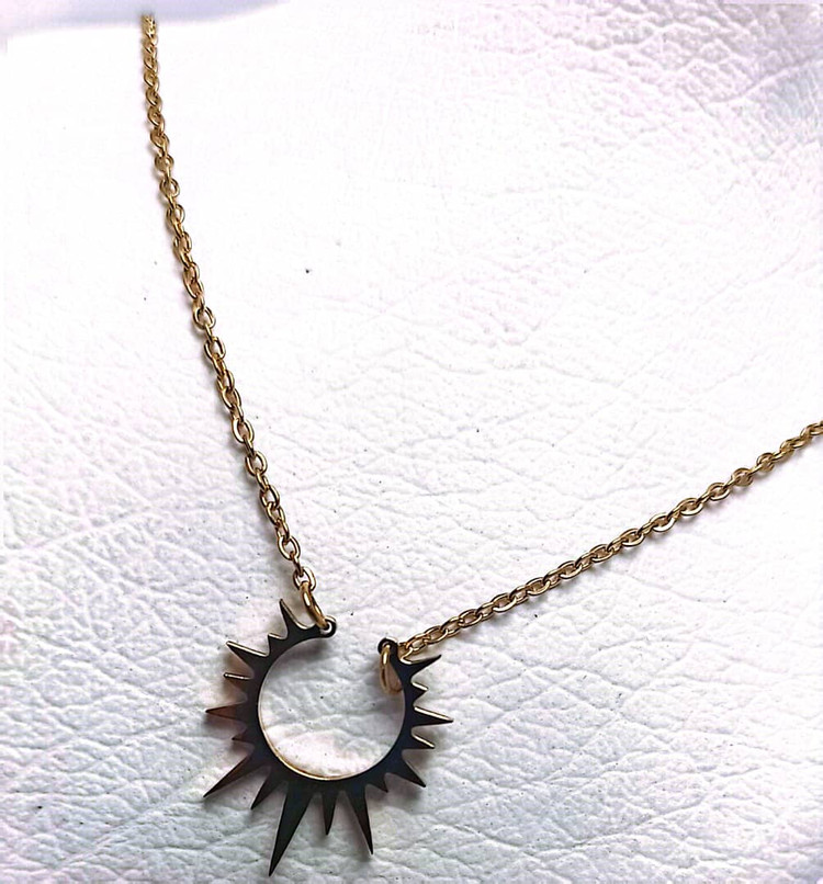 این گردنبند با طراحی خاص و متفاوت، آویزی به شکل دایرهای با اشکال نوکدار دارد که شبیه به خورشید طراحی شده است. ترکیب زنجیر طلایی و آویز سیاه رنگ، ظاهری مدرن و جذاب به آن بخشیده. این گردنبند گزینهای عالی برای افرادی است که به دنبال جواهرات منحصر به فرد و شیک میگردند