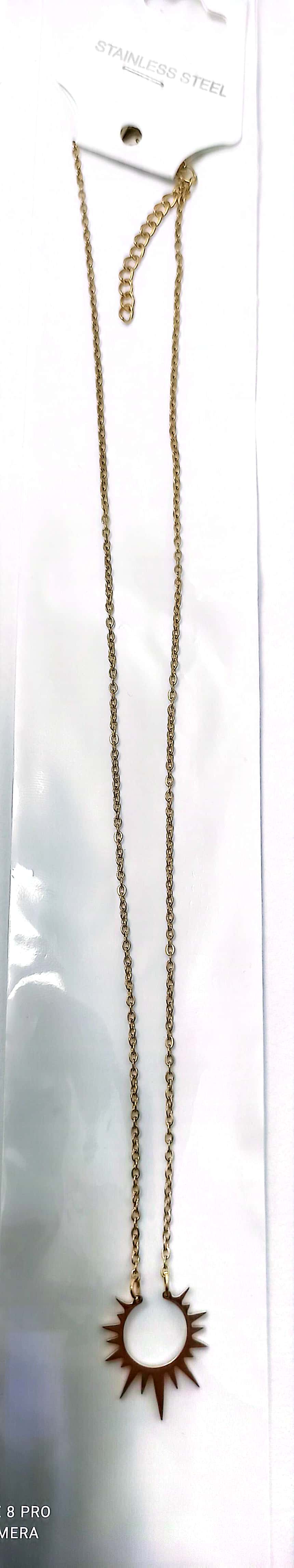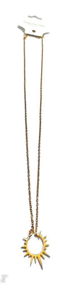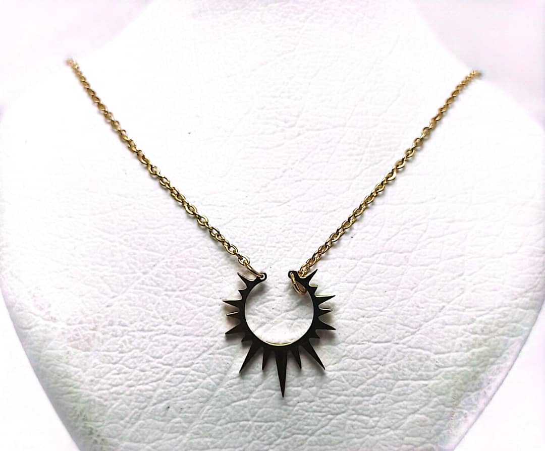 این گردنبند با طراحی خاص و متفاوت، آویزی به شکل دایرهای با اشکال نوکدار دارد که شبیه به خورشید طراحی شده است. ترکیب زنجیر طلایی و آویز سیاه رنگ، ظاهری مدرن و جذاب به آن بخشیده. این گردنبند گزینهای عالی برای افرادی است که به دنبال جواهرات منحصر به فرد و شیک میگردند