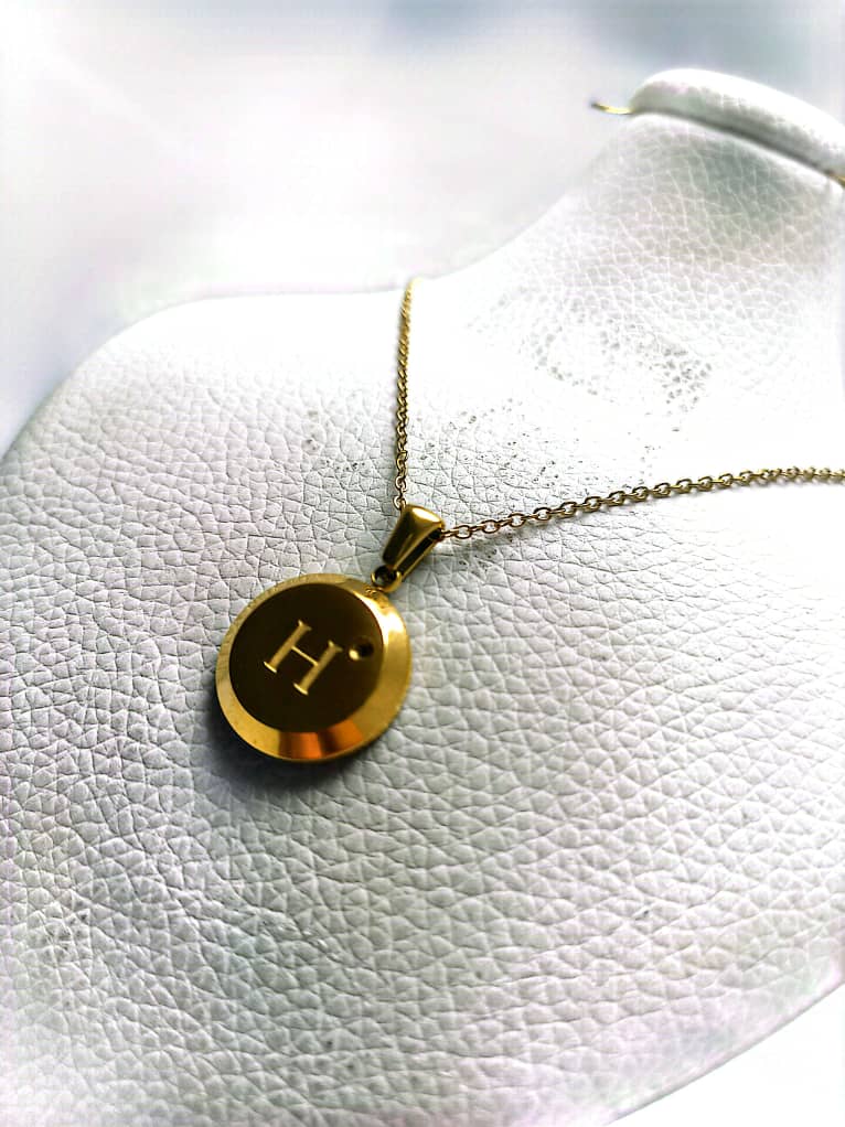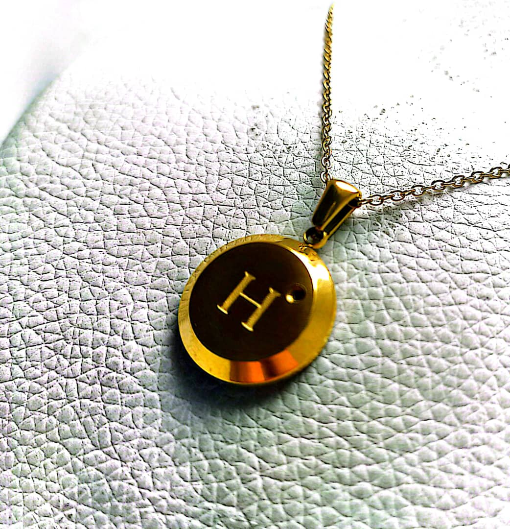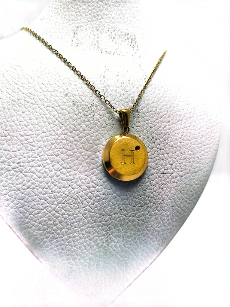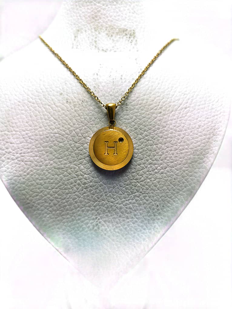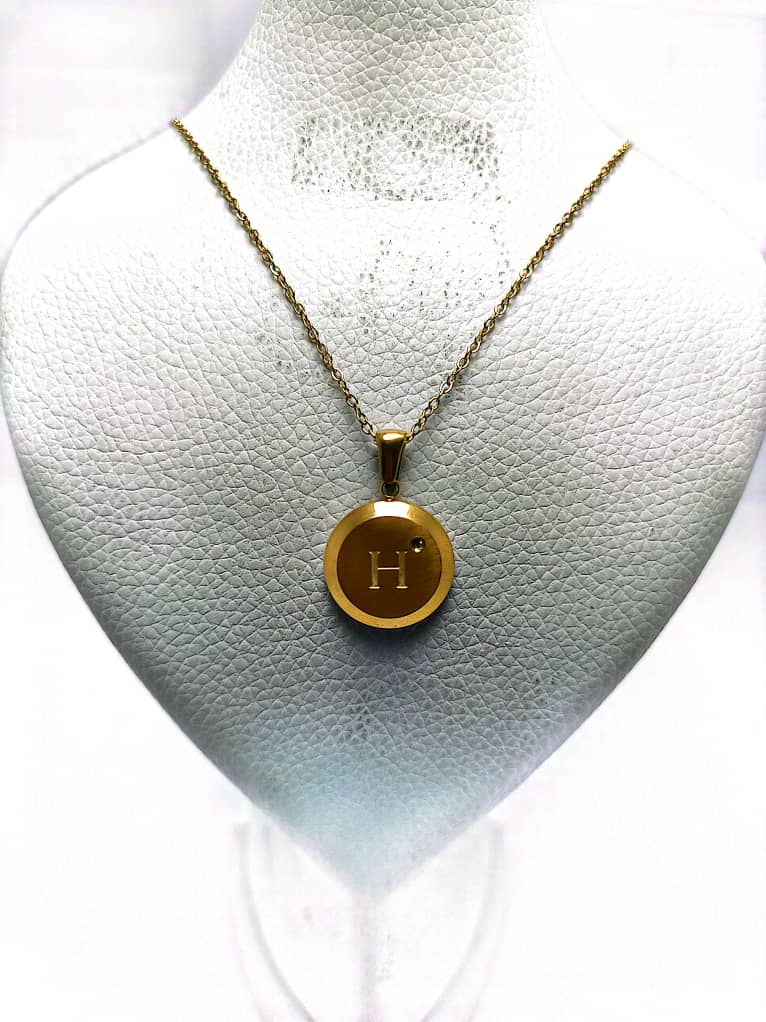 گردنبند طلایی با آویز دایرهای، حکاکی حرف H و نگین ظریف براق. طراحی شیک و مینیمال، مناسب استفاده روزانه و هدیهای خاص برای عزیزان.